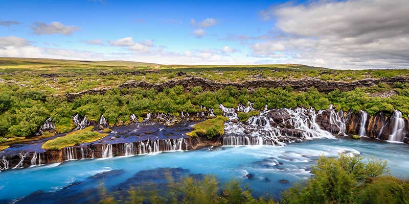 After a Reykjavík city tour, head north from Iceland's capital to West Iceland, where you'll be introduced to the Icelandic Sagas in the settlement center in Borgarnes. The afternoon is filled with impressive natural spots: Deildartunguhver, one of the most voluminous hot springs in Europe, and Hraunfossar, the unique waterfall that drains from under vast lava fields into the river Hvítá. End the day learning about Icelandic history at the cultural site at Reykholt.